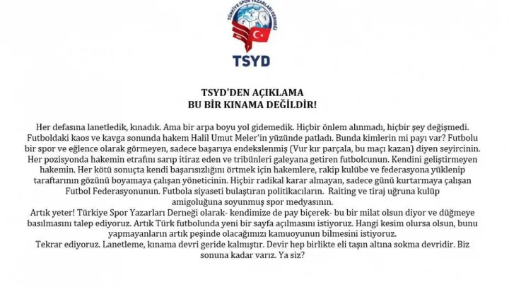 Ankaragücü-Çaykur Rizespor maçının ardından hakem Halil Umut Meler'e yapılan fiziksel saldırı sonrası Türkiye Spor Yazarları Derneği (TSYD) kınama mesajı yayımladı.