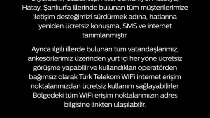 ''Deprem bölgesinde iletişimin devamlılığı için Türk Telekom olarak var gücümüzle çalışmalarımıza devam ediyoruz. Kahramanmaraş, Adıyaman, Adana, Diyarbakır, Gaziantep, Kilis, Osmaniye, Malatya, Hatay, Şanlıurfa illerinde bulunan tüm müşterilerimize iletişim desteğimizi sürdürmek adına, hatlarına yeniden ücretsiz konuşma, SMS ve internet tanımlanmıştır.