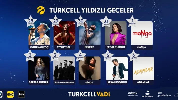 Müzikseverlerin her yıl ilgiyle takip ettiği Turkcell Yıldızlı Geceler konserleri bu yaz 28 Temmuz'da Oğuzhan Koç ile başlıyor. 29 Temmuz'da Ziynet Sali ile devam eden ve Türkiye'nin yıldız sanatçılarını sanatseverlerle buluşturan Turkcell Yıldızlı Geceler konserleri; Vadi İstanbul, SM Production ve Atlantis Yapım iş birliğiyle Turkcell Vadi Açık Hava Sahnesi'nde gerçekleştiriliyor. 6 Ağustos'a kadar yıldız yağmurunun yaşanacağı açık hava sahnesinde, müzik tutkunları Berkay, Fatma Turgut, MaNga, Sertab Erener, Yüzyüzeyken Konuşuruz, Simge Sağın, Kenan Doğulu ve Adamlar ile unutulmaz akşamlar yaşayacak. Ayrıca müzikseverler Oğuzhan Koç, Ziynet Sali, Fatma Turgut ve Simge Sağın konserlerinden önce de fizy dj etkinliklerinde keyifli vakit geçirecekler.
