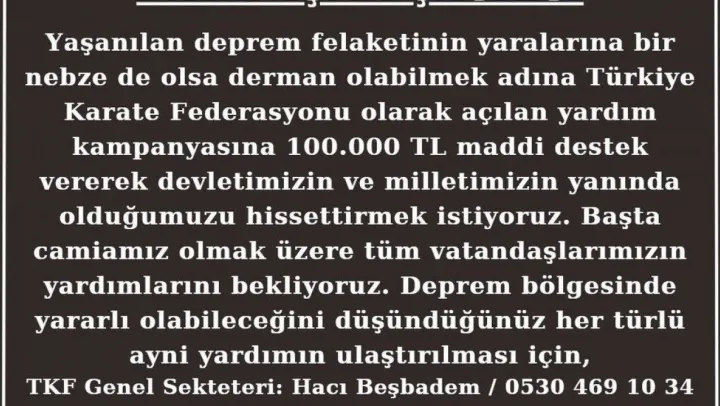 Türkiye Karate Federasyonu (TKF), merkez üssü Kahramanmaraş ve çevre illerde depremden etkilenen depremzedeler için 100 bin TL nakdi yardım desteği vereceğini açıkladı.