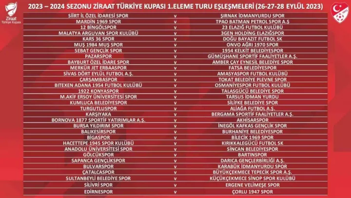 Ziraat Türkiye Kupası 1. Eleme Turu eşleşmeleri belli oldu. 62 takımın mücadele edeceği ve tek maç eleminasyon sistemine göre yapılacak 1. Eleme Turu karşılaşmaları 26, 27 ve 28 Eylül tarihlerinde oynanacak.