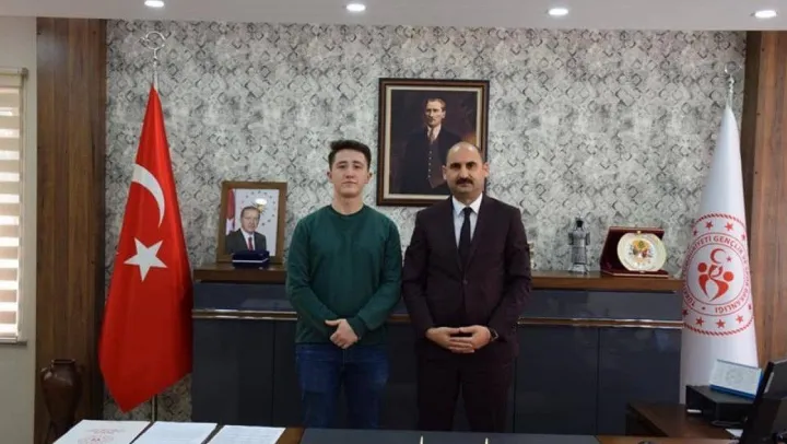 Şiir yarışmasında Türkiye üçüncüsü olan Enes Yalnız, Bilecik Gençlik ve Spor İl Müdürü Yasin Özdemir ile bir araya geldi.
