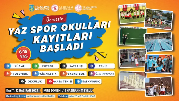 Silivri Belediyesi tarafından düzenlenen 2023 Yaz Spor Okullarında kayıt dönemi başladı. Etkinlik ile 6-15 yaş aralığındaki çocuklara yüzme, futbol, satranç, tenis, voleybol, cimnastik, basketbol, özel sporcular, okçuluk, masa tenisi ve taekwondo gibi toplam 11 branşta ücretsiz kurslar verilecek.