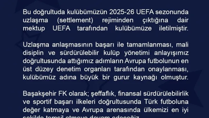 Başakşehir Kulübü, UEFA Kulüp Finansal Kontrol Kurulu'nun (CFCB) belirlemiş olduğu futbol kazançları kurallarına 2024/25 sezonu itibarıyla tam uyum sağladıklarına dair UEFA tarafından bilgilendirildiklerini duyurdu.