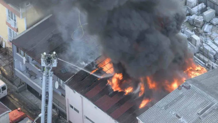 Ümraniye'de bir iş yerinin çatısı alev alev yandı. İtfaiye ekipleri tarafından söndürülen yangın, dron ile havadan görüntülendi.