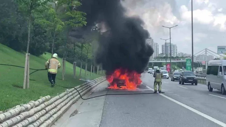 Ümraniye'de yolda ilerleyen bir otomobil alev alev yandı. İtfaiye ekipleri yangına müdahale ederek söndürdü. Yangın anları cep telefonu kamerasına yansıdı.