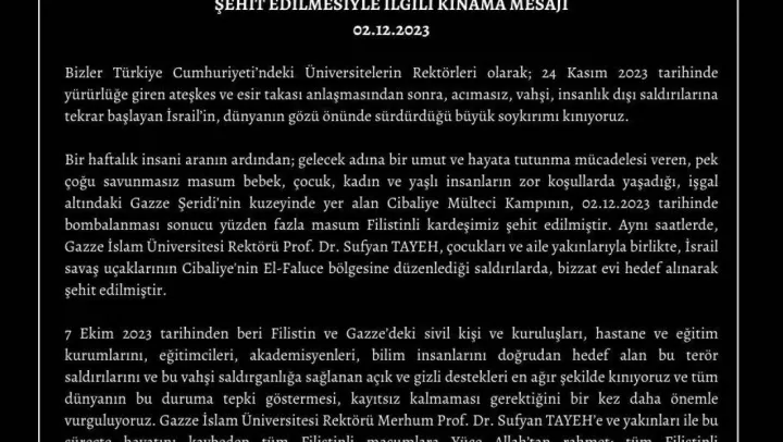 Türkiye'deki üniversite rektörleri, Gazze İslam Üniversitesi Rektörü Prof. Dr. Sufyan Tayeh'in öldürülmesini kınadı.