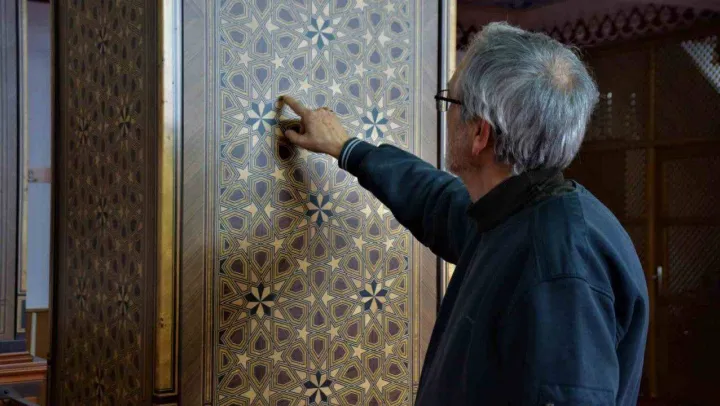 35 yıldır marküteri sanatıyla uğraşan Adil Fikret Turgaç, 'Buradaki desenlerde Osmanlı'da kullanılan 10 köşeli yıldızdan gittik. Bütün filatoları tek tek keserek, uzaktan bakıldığında başka desen, yakından bakıldığında başka desen olacak şekilde tasarladık. Tüm sütunları kapladık. Her sütunda normalde Selçuklu deseni olmasına rağmen, hepsinde farklı görünüm ortaya çıktı. Keza bunlara tamamlanması için sütun altlıkları, sütun kafaları ve kirişlere de marküteriyle dekupaj çalışmasını uyguladık. Bunlar tamamen el işçiliğiyle yapıldı. Herhangi bir makine kullanılmadı. Filatoların kesilmesi, ağaçların kesilmesi, bantlanması, zımparalanması, A'dan Z'ye el işiyle çıktı' dedi.