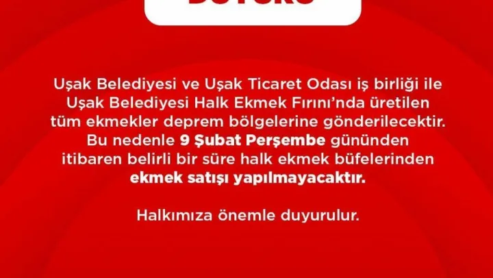 Uşak'ta 9 Şubat Perşembe günü itibariyle halk ekmek fırınlarında üretilen bütün ekmeklerin deprem bölgesine gönderileceği ve bu nedenle ekmek satışı yapılmayacağı duyuruldu.