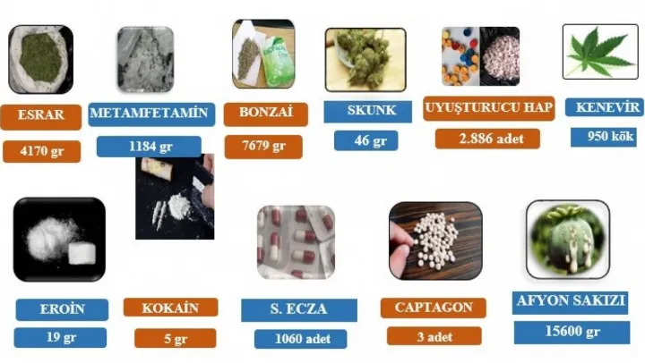 Jandarma ekipleri ise haziran boyunca 51 olayda 84 şahsa adli işlem başlattı. 81 şahıs serbest bırakılırken 3 şahıs ise tutuklandı. Yapılan çalışmalar neticesinde 2 bin 527 gram bonzai, bin 117 gram esrar, 254 gram metamfetamin, 23 gram skunk, 34 sentetik ecza, bin 680 uyuşturucu hap ve 22 kök kenevir ele geçirildi.