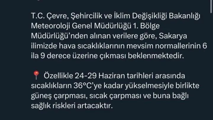 Meteoroloji Genel Müdürlüğü'nün verilerine göre Sakarya'da hava sıcaklıklarının önümüzdeki günlerde mevsim normallerinin 6 ila 9 derece üzerine çıkması bekleniyor. Bu gelişmenin ardından Sakarya Valiliği, özellikle 24-29 Haziran tarihleri arasında yaşanacak aşırı sıcaklara karşı vatandaşları 11.00-16.00 saatleri arasında dışarı çıkmamaları yönünde uyardı.