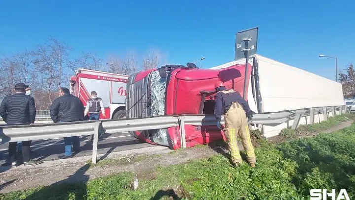 Silivri bölge trafik köprüsü mevki'inde viraja hızlı giren tır yan yattı. Bir süre sürüklenen tır bariyerlere çarparak dururken, sürücü emniyet kemeri sayesinde kazandan burnu bile kanamadan kurtuldu. Tırın sürüklenişi ve bariyerlere çarpma anı kamerada
