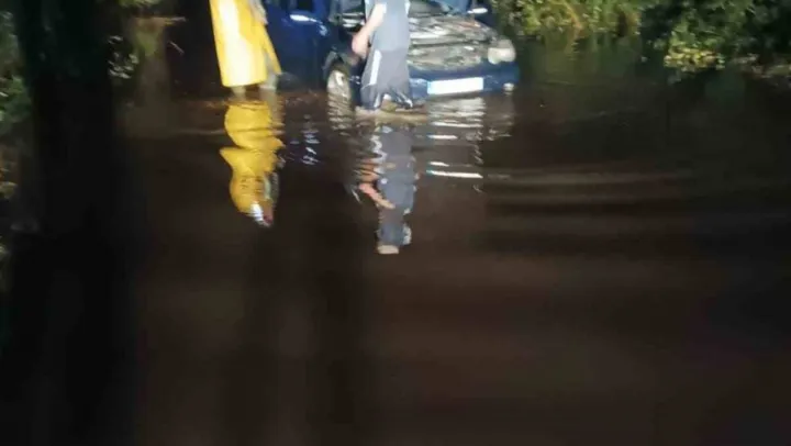 Yağış sonrası göle dönen sokakta otomobiliyle mahsur kaldı