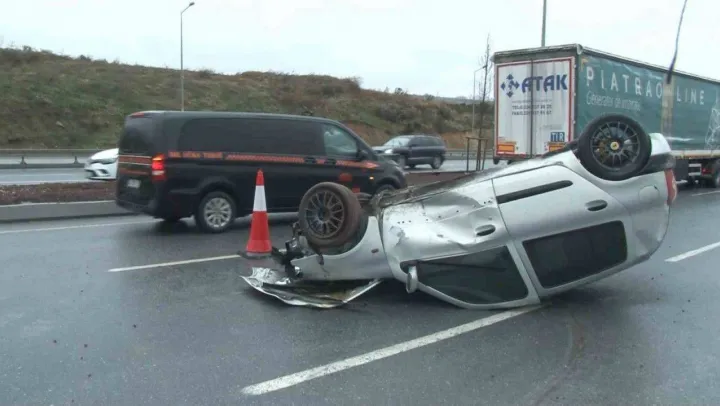 Başakşehir Çam ve Sakura Şehir Hastanesi'ne giden yolda yağışlı hava nedeniyle direksiyon hakimiyetini kaybeden sürücüler kaza yaptı. Bir otomobil takla atarken, bir minibüs ise refüje çıkarak durabildi.