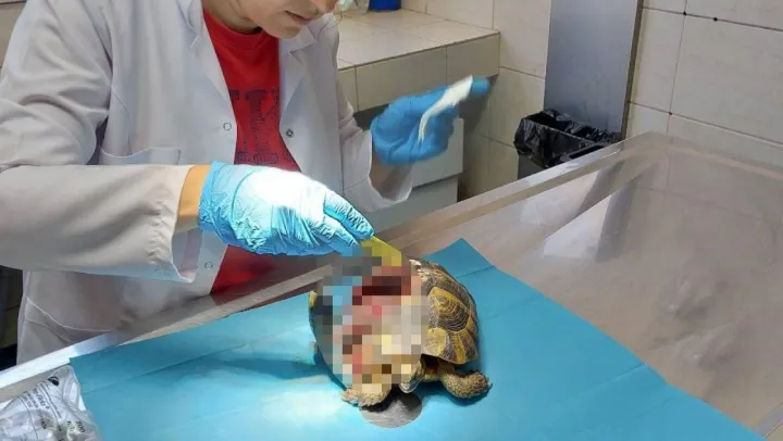 Yalova'da doğada kabuğu kırılmış şekilde yaralı olarak bulunan kaplumbağanın tedavisi yapıldı.