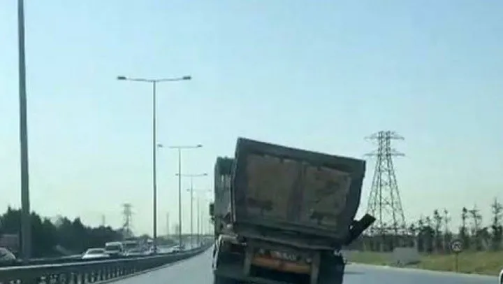 Sultangazi'de hafriyat kamyonunun kasa kısmının yamuk şekilde ilerlediği anlar cep telefonu kamerası tarafından görüntülendi. Görüntüde, tehlikeli şekilde yola devam eden hafriyat kamyonun arka tekerlerinin yere değmediği görüldü.