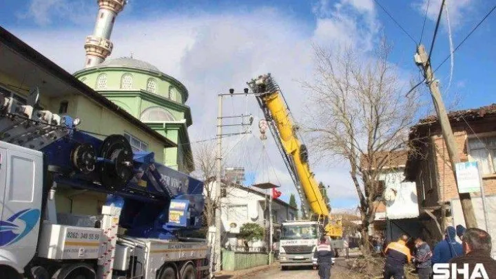 Kocaeli'nin İzmit ilçesinde etkili olan şiddetli lodos sebebiyle yan yatan caminin minaresi, belediye ekipleri tarafından indirilmeye çalışılıyor.