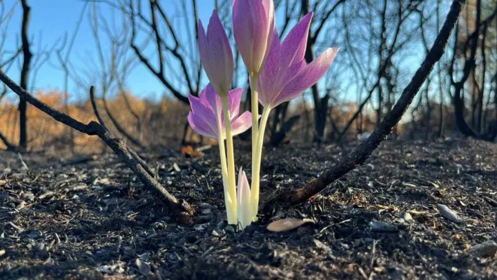 Bursa'nın Yenişehir ilçesine bağlı Marmaracık köyü'nde çıkan yangın sonrası ormanda açan Güz Çiğdemi çiçeği görenleri hayrete düşürdü.
