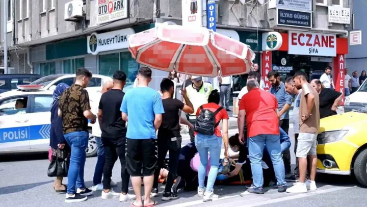 Edirne'de karşıdan karşıya geçerken taksinin çarptığı yaralı kadını, bir vatandaş marketten aldığı şemsiye ile güneşten korumaya çalıştı.