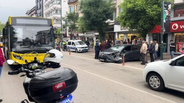 Bursa'da yolcu indirmek için durağa yanaşan halk otobüsüne ters şeritten gelen otomobil çarptı. Kazada otomobil sürücüsü yaralanırken, çevredeki vatandaşlar korku dolu anlar yaşadı.