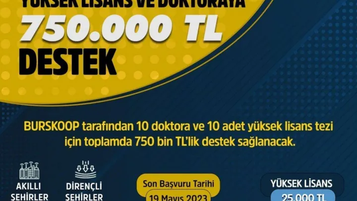 Eğitimin her kademesinde önemli yatırımları hayata geçiren Bursa Büyükşehir Belediyesi'nin üniversite ve meslek lisesi öğrencilerine yönelik burs uygulaması lisansüstü seviyeye taşındı. Türkiye'deki üniversitelerde Bursa ölçeğinde, 'Akıllı Şehirler, Dirençli Şehirler ve Sürdürülebilir Şehirler' olmak üzere 3 tema çerçevesinde yürütülecek olan araştırmalar için BURSKOOP'un lisansüstü tez desteğinden yararlanılabilecek. İlk kez verilecek Lisansüstü Tez Desteğinden ilgili alanlarda çalışma yürüten 10 doktora ve 10 yüksek lisans öğrencisi yararlanacak. Her bir doktora tezi için 50 bin TL, her bir yüksek lisans tezi için de 25 bin TL olarak belirlenen destekle toplamda 750 bin TL'lik destek sağlanmış olacak.