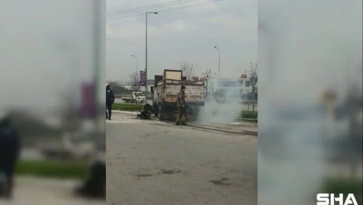 Bursa'da balataları sıkışan kamyon alev aldı. Zamanında müdahale, içinde on binlerce lira değerinde makine olan kamyonu yanmaktan kurtardı.
