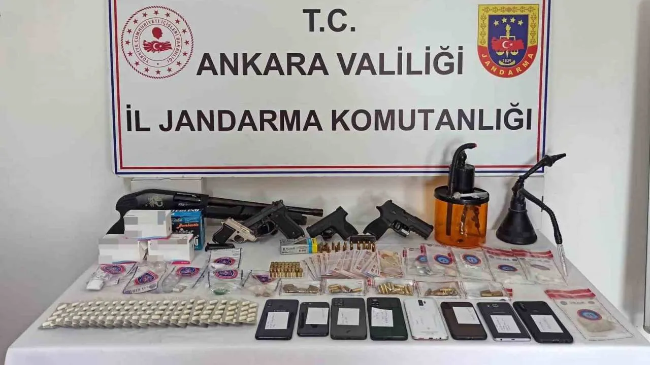 Ankara İl Jandarma Komutanlığı Kaçakçılık ve Organize Şube Müdürlüğü ekipleri, Altındağ, Etimesgut, Keçiören, Mamak, Pursaklar, Sincan ve Yenimahalle ilçelerinde belirledikleri 17 şüpheliye yönelik 14 adrese eş zamanlı operasyon düzenledi. Operasyonda 12 şüpheli gözaltına alınırken, adreslerde yapılan aramalarda 61 gram metamfetamin, 10 gram eroin, 186 adet sentetik ecza hap, 1 gram esrar, 1 gram kenevir, 11 adet uyuşturucu kullanma aparatı, 1 adet hassas terazi, 17 adet cep telefonu, 17 adet sim kart, 1 adet hafıza kartı, 1 adet av tüfeği, 15 adet av tüfeği fişeği, 1 adet kurusıkı tabanca, 41 adet kurusıkı tabanca fişeği, 2 adet 9 mm çapında tabanca, 1 adet 7.65 mm çapında tabanca, 138 bin TL, 300 ABD doları, 1 adet şarjör ve 58 adet 9 mm çapında tabanca fişeği ele geçirildi. Firari şahısların yakalanmasına yönelik çalışmaların devam ettiği aktarıldı.