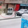 Esenler’de otomobil ile çarpışan ticari araç, savrularak yol kenarındaki yön levhasının bulunduğu direğe çarptı. Bu sırada kaldırımda yürüyen anne ile çocuğu, aracın direğe çarpması sonucu kurtuldu. Anne ile çocuğun inanılmaz kurtuluşu kameraya böyle yansıdı.