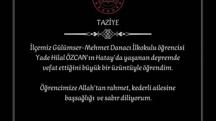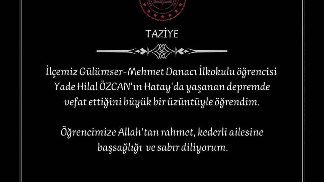 Bodrum İlçe Milli Eğitim Müdürü Bülent Aldal, yaptığı paylaşımda “İlçemiz Gülümser Mehmet Danacı İlkokulu öğrencisi Yade Hilal Özcan’ın Hatay’da yaşanan depremde vefat ettiğini büyük bir üzüntüyle öğrendim. Öğrencimize Allah’tan rahmet, kederli ailesine başsağlığı ve sabır diliyorum” dedi.