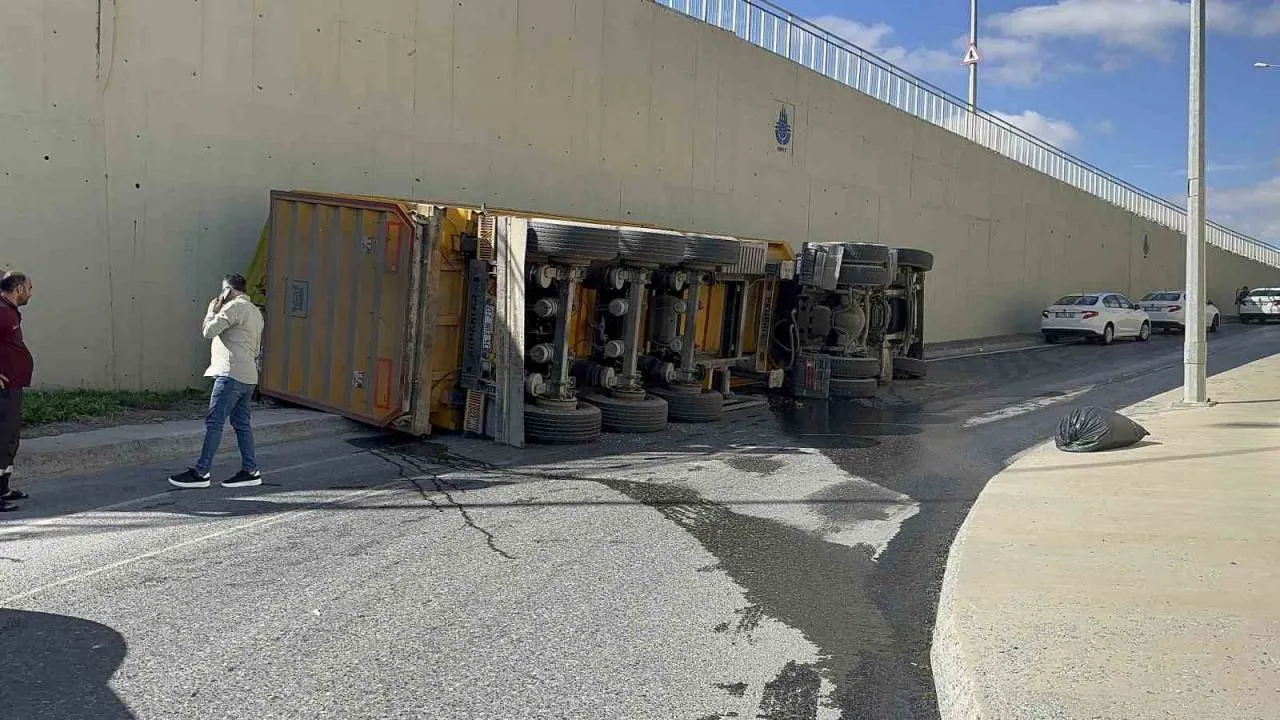 Arnavutköy'de sürücüsünün kontrolünden çıkan kamyon yan yattı, faciadan dönüldü