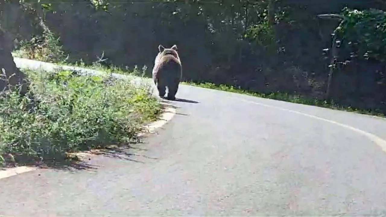 Aksu Mahallesi yolunda seyahat eden vatandaşların güzergahında yola inen boz ayı görüntülendi. Aracın önünde bir süre koşan boz ayı daha sonra yoldan çıkarak ormanlık araziye girdi. Ayının, aracın önünde koştuğu anlar ise cep telefonu kamerasıyla görüntülendi.