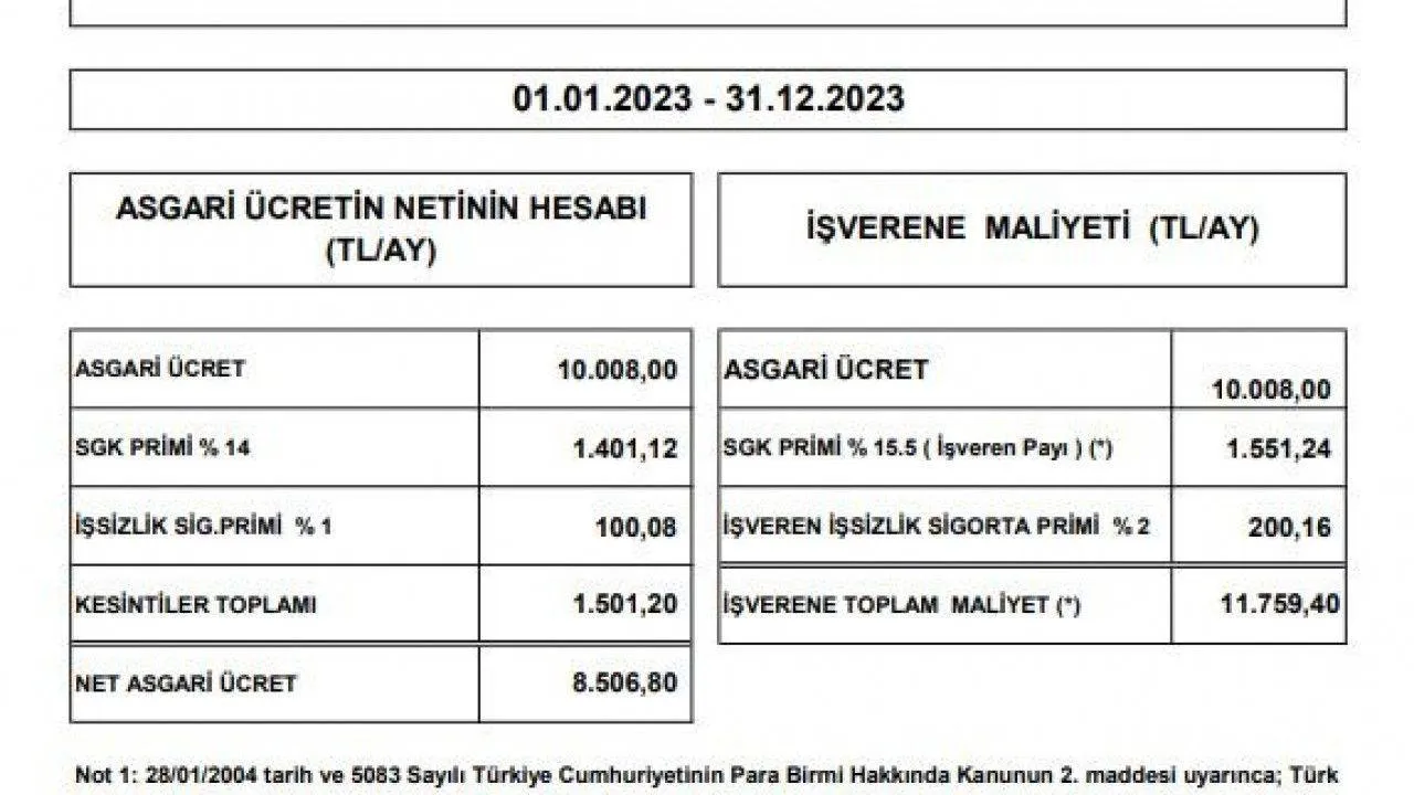 Ocak 2023’ten itibaren verilecek olan asgari ücretin işverene maliyeti de belli oldu. Yapılan hesaplamaya göre brüt 10 bin 8 lira olan asgari ücrete ek olarak bin 551 lira 24 kuruş SGK primi (işveren payı), 200 lira 16 kuruş da işveren işsizlik sigorta primi eklendi. Böylece asgari ücretin işverene maliyeti 11 bin 759 lira 40 kuruş olarak hesaplandı.