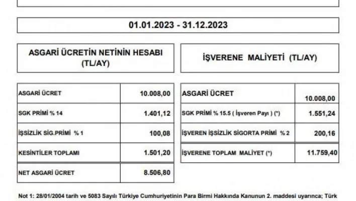 Yeni yılda geçerli olacak asgari ücret ise Cumhurbaşkanı Recep Tayyip Erdoğan tarafından yüzde 54,54 oranında zam ile net 8 bin 506 lira olarak açıklandı. Bu seneki hesaplamalarda brüt 10 bin 8 lira olan asgari ücretin bin 401 lira 12 kuruşu SGK primi, 100 lira 8 kuruşunu işsizlik sigorta fonu oluşturuyor. Buna göre yeni yılda verilecek net asgari ücret, toplam bin 501 lira 20 kuruşluk kesintiyle beraber net 8 bin 506 lira oldu.