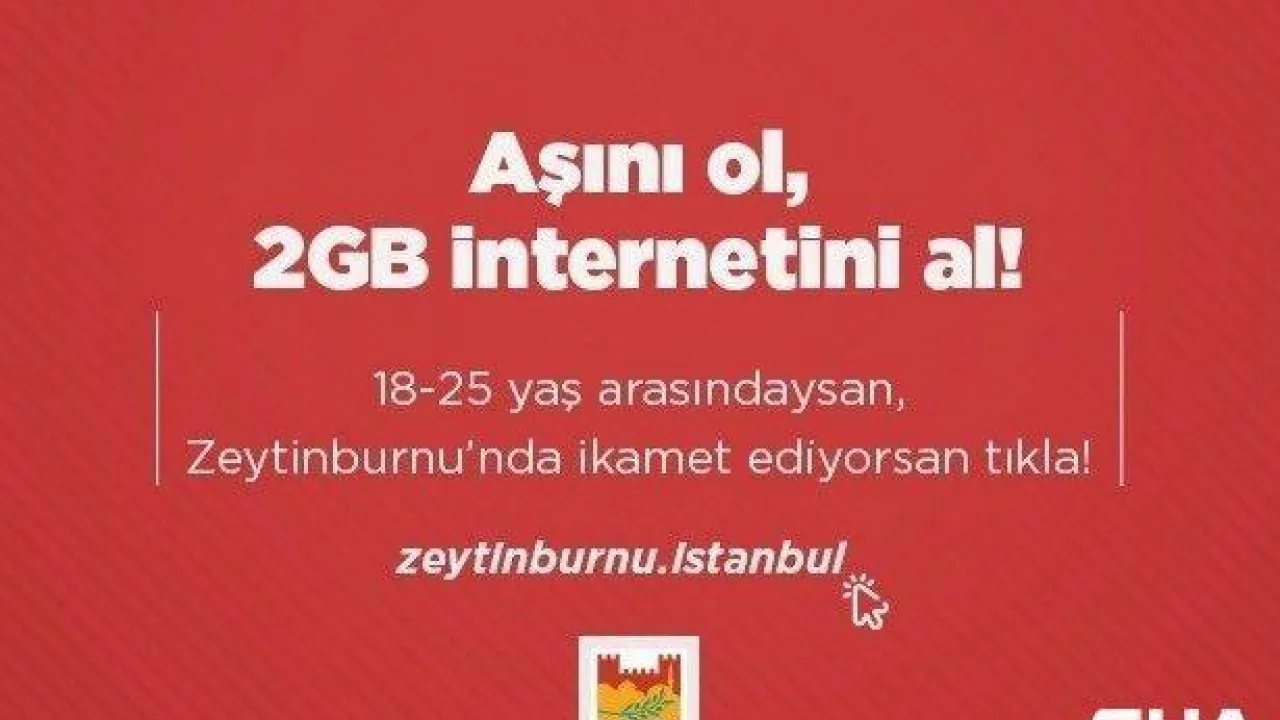 Zeytinburnu Belediyesi covid19 aşısı olan gençlere 2GB mobil internet hediye ediyor. Zeytinburnu Belediyesi gençleri aşı olmaya teşvik etmek için yeni bir kampanya başlattı. İlçede ikamet eden 18 - 25 yaş aralığındaki gençlere çağrıda bulunan Zeytinburnu Belediyesi, aşısını olanlara 2GB internet hediye ediyor. “Aşını ol, 2GB İnternetini Al” kampanyasına katılım Zeytinburnu. İstanbul adresi üzerinden online olarak yapılabiliyor. Aşı olduktan sonra sitedeki form bilgilerine TC kimlik numarası ve cep telefonun yazılması yeterli oluyor.