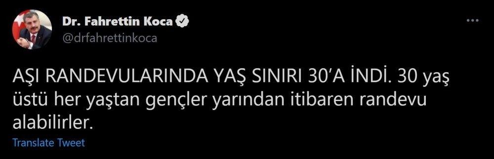Sağlık Bakanı Fahrettin Koca, sosyal medya hesabından yaptığı paylaşımda, “Aşı randevularında yaş sınırı 30'a indi. 30 yaş üstü her yaştan gençler yarından itibaren randevu alabilirler” ifadelerine yer verdi.