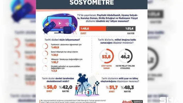 Araştırma Şirketi Areda Survey, Aralık ayı Sosyometre araştırmasında Türk halkının tarihi dizilere merakını masaya yatırdı. Katılımcıların yüzde 48.6’sı Payitaht Abdülhamit, Uyanış Selçuklu, Kuruluş Osman, Diriliş Ertuğrul ve Muhteşem Yüzyıl gibi dizileri izlediğini ifade ederken, yüzde 51.7’si ilgili dizilerin milli şuur inşa ettiğini söyledi. Araştırmada yer alan, ‘tarihi dizileri niçin izliyorsunuz’ sorusuna yüzde 49.9 ile ‘tarihimizi, atalarımızı öğrenmek için’ yanıtı verilmesi dikkat çekti.
