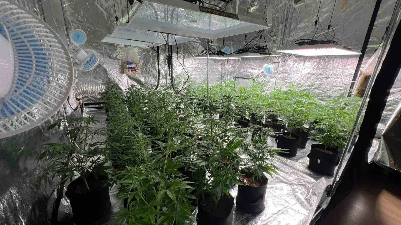 İkamette yapılan incelemelerde sera sistemi düzeneği içerisinde uyuşturucu madde imalatı yapıldığı tespit edildi. Evde yapılan aramalarda ise, 49 kök toplamda 14,723 kg marihuana, 386,5 gr. marihuana, 434 gr. metamfetamin, 42,639 litre uyuşturucu madde yapımında kullanılan kimyasal madde, 6 adet fan sistemi düzeneği, 6 adet ışık sistemi düzeneği, 1 adet termostat sistemi düzeneği, 1 adet ruhsatsız tabanca, 2 adet şarjör, 14 adet fişek ele geçirildi.