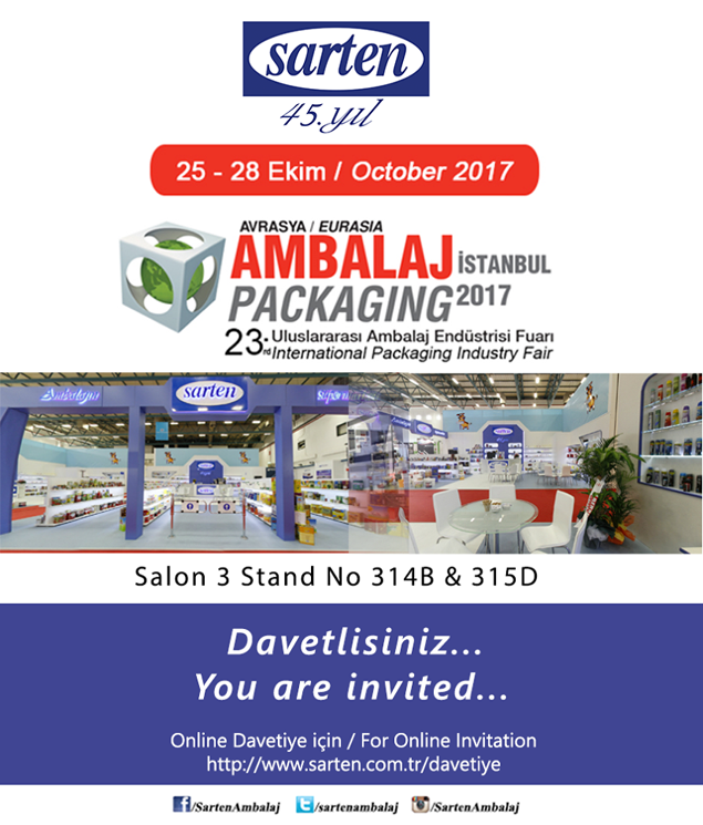 25-28 Ekim 2017 tarihlerinde Tüyap Fuar ve Kongre Merkezi, İstanbul’da gerçekleşecek Avrasya Ambalaj Fuarı hakkında daha detaylı bilgiye sahip olmak ve online davetiye almak için www.packagingfair.com websitesini ziyaret edebilirsiniz.
