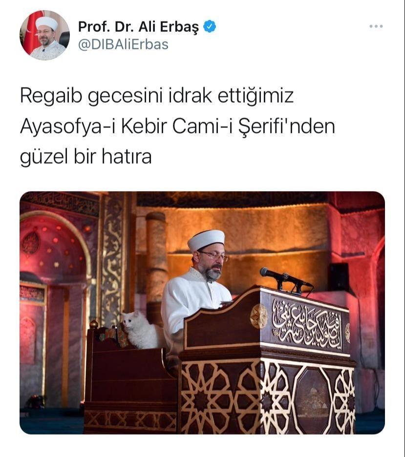 Öte yandan Diyanet İşleri Başkanı Prof. Dr. Ali Erbaş’ın duası sırasında yanına beyaz bir kedi geldi. Erbaş, kedi ile karesini “Regaip gecesini idrak ettiğimiz Ayasofya-i Kebir Cami-i Şerifi’nden güzel bir hatıra” diye sosyal medya hesabından paylaştı.