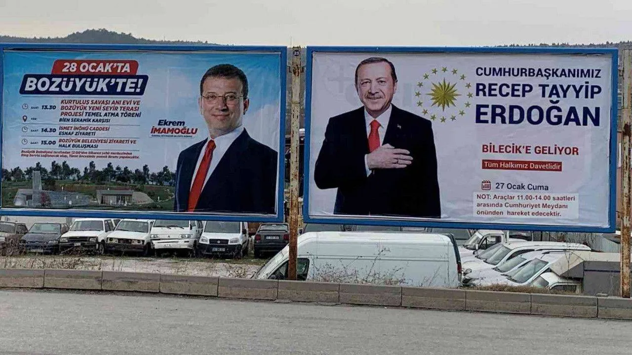 Cumhurbaşkanı Recep Tayyip Erdoğan'ın Bilecik gezisi sebebi ile ziyaret edeceği Bozüyük ilçesindeki birçok bilboardda, aynı ilçeyi yarın ziyaret etmesi beklenen İstanbul Belediye Başkanı Ekrem İmamoğlu'nun fotoğrafları yan yana yapıştırıldı.