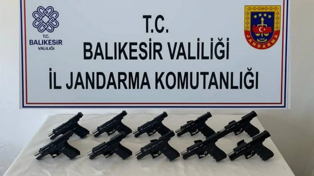 Balıkesir’in Ayvalık ilçesinde jandarma tarafından yapılan operasyonda 10 tabanca ve 8 adet sentetik uyuşturucu hap ele geçirildi.