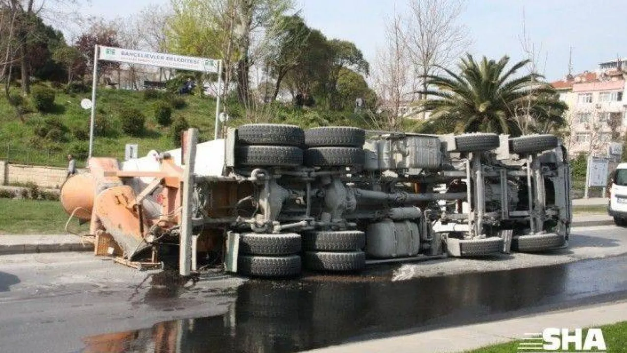 BAHÇELİEVLER'DE VİRAJI ALAMAYAN BETON MİKSERİ KALDIRIMA ÇARPIP YOLA DEVRİLDİ. KAZADA 1 KİŞİ YARALANDI.