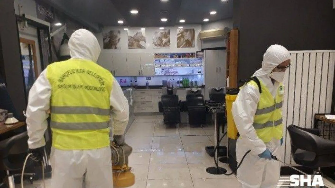 BAHÇELİEVLER'DE AÇILIŞA HAZIRLANAN KUAFÖRLERDE DEZENFEKSİYON ÇALIŞMALARI BAŞLADI.