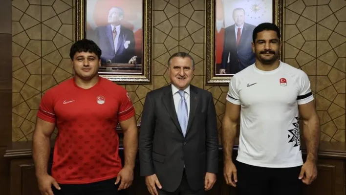 Gençlik ve Spor Bakanı Osman Aşkın Bak, Türkiye Güreş Federasyonu Başkanı Şeref Eroğlu ile milli güreşçiler Taha Akgül ile Rıza Kayaalp’i kabul etti.