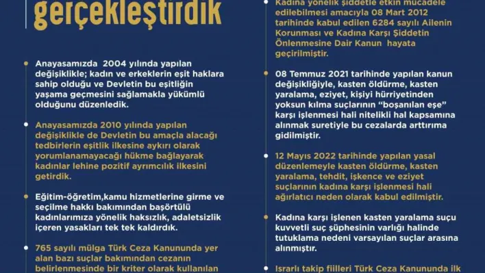 Adalet Bakanı Bozdağ, sosyal medya hesabından kadın hakları ve kadına yönelik şiddetin önlenmesi konusunda yaptıkları reformlar hakkında bir paylaşım yaptı. Bakan Bozdağ, 2004 yılında anayasada yapılan değişiklikle kadın ve erkeklerin eşit haklara sahip olduğunu ve devletin bu eşitliği yaşama geçmesini sağlamakla yükümlü olduğunu hatırlattı.