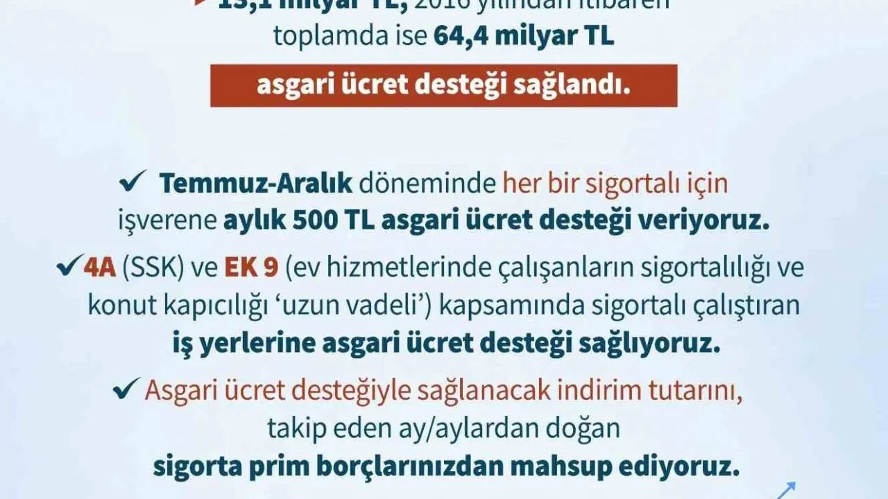 Sosyal Güvenlik Kurumu’ndan (SGK) alınan bilgilere göre, 1 milyon 781 bin 89 işletmeye bu yılın ocak ve mayıs aylarında 13,1 milyar lira, 2016 yılından itibaren ise 64,4 milyar lira asgari ücret desteği sağlandı. Çalışma ve Sosyal Güvenlik Bakanı Vedat Işıkhan sosyal medya üzerinden yaptığı paylaşımda, “Son 7 yılda 1.7 milyonun üzerinde işletmeye 64 milyar lirayı aşkın asgari ücret desteği sağladık. Ülkemizi daha müreffeh yarınlara işverenlerimiz ve çalışanlarımızla birlikte hazırlayacağız” ifadelerini kullandı.