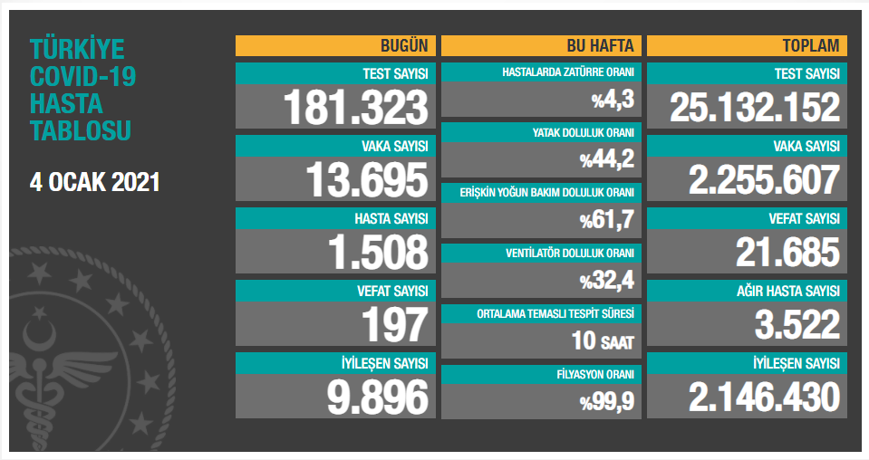 Bugün yapılan 181 bin 323 testten 13 bin 695 yeni vaka sayısı, bin 508 de yeni hasta sayısı olduğu belirtildi. Toplam vaka sayısının 2 milyon 255 bin 607 olduğu, bugün iyileşen 9 bin 896 kişiyle birlikte toplam iyileşen hasta sayısının 2 milyon 146 bin 430'a yükseldiği, toplam hastalarda zatürre oranının yüzde 4,3, ağır hasta sayısının ise 3 bin 522 olduğu açıklandı.