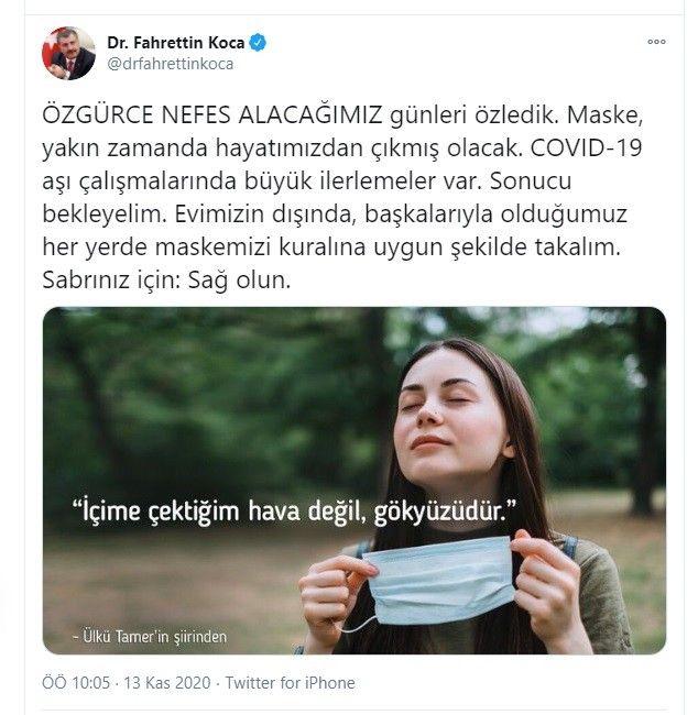 Sağlık Bakanı Fahrettin Koca, Twitter hesabında yaptığı paylaşımda, “Özgürce nefes alacağımız günleri özledik. Maske, yakın zamanda hayatımızdan çıkmış olacak. Covid-19 aşı çalışmalarında büyük ilerlemeler var. Sonucu bekleyelim. Evimizin dışında, başkalarıyla olduğumuz her yerde maskemizi kuralına uygun şekilde takalım. Sabrınız için: Sağ olun” ifadelerini kullandı.