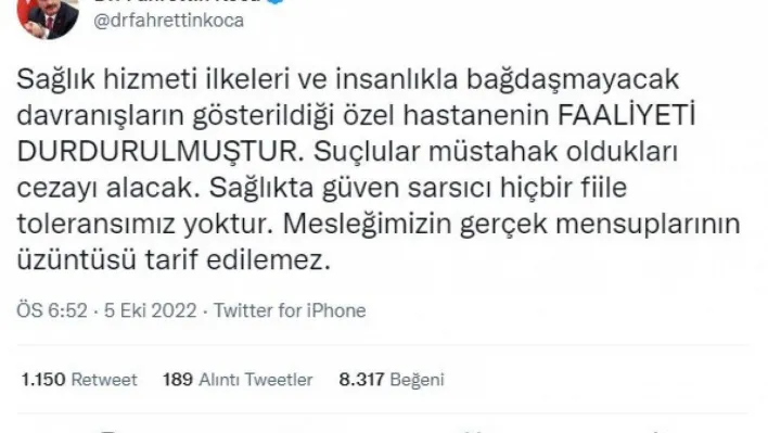 Sağlık Bakanlığı’na bağlı müfettişlerin özel hastanedeki incelemelerinin ardından olay hakkında sosyal medya hesabı üzerinden bir kez daha paylaşımda bulunan Bakan Koca, "Sağlık hizmeti ilkeleri ve insanlıkla bağdaşmayacak davranışların gösterildiği özel hastanenin faaliyeti durdurulmuştur. Suçlular müstahak oldukları cezayı alacak. Sağlıkta güven sarsıcı hiçbir fiile toleransımız yoktur. Mesleğimizin gerçek mensuplarının üzüntüsü tarif edilemez” dedi.
