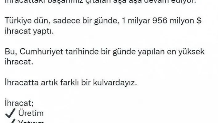 Ticaret Bakanı Mehmet Muş, sosyal paylaşım sitesi Twitter hesabından yaptığı paylaşımla Türkiye’nin dün, sadece bir günde 1 milyar 956 milyon dolar ihracat yaptığını açıkladı. Bakan Muş, paylaşımında, “İhracattaki başarımız çıtaları aşa aşa devam ediyor. Türkiye dün, sadece bir günde, 1 milyar 956 milyon dolar ihracat yaptı. Bu, Cumhuriyet tarihinde bir günde yapılan en yüksek ihracat. İhracatta artık farklı bir kulvardayız. İhracat; üretim, yatırım, istihdam demektir” ifadelerine yer verdi.